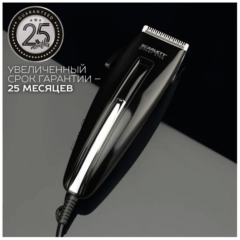 Работает машинка для стрижки Scarlett SC-HC63C11 от электросети. К ней она подключается за счет 1.7-метрового кабеля. Модель нетребовательна в уходе – после использования ей достаточно сухой чистки и смазывания маслом.